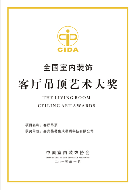 伴随着羊年的钟声,希冀与荣誉相携而来。继“产品创新奖”、“2014年集成吊顶最具行业影响力十大品牌”之后,格勒再度获评中国室内装饰协会颁发的“全国室内装饰客厅吊顶艺术大奖”。中国室内装饰协会是19889月成立的经政府批准组建的室内装饰行业全国性组织。如此权威机构对格勒客厅吊顶的认可是格勒全屋吊顶向纵深方向上推进的莫大动力。